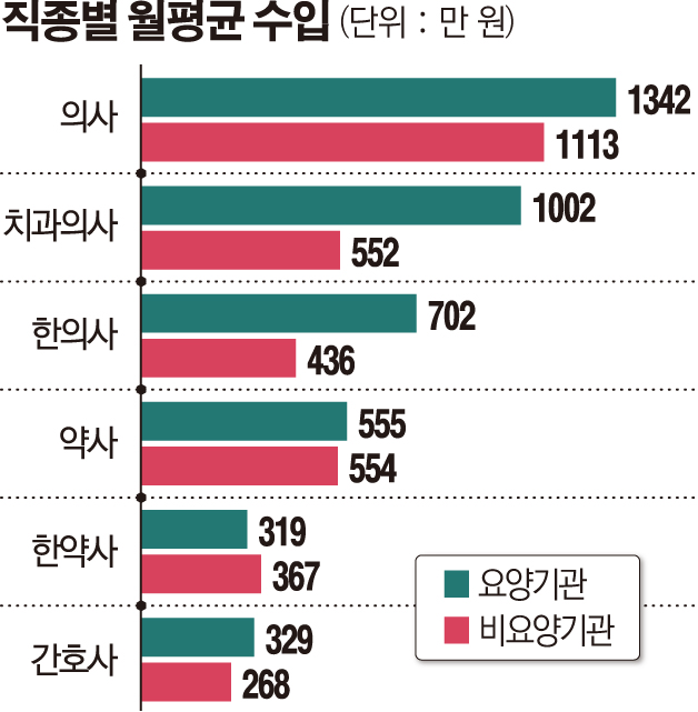 병·의원 등 요양기관에서 근무하는 의사의 월평균 수입이 1342만 원인 것으로 집계됐다. 이는 치과의사(1002만 원), 한의사(702만 원) 등과 비교해도 높은 수준이다.