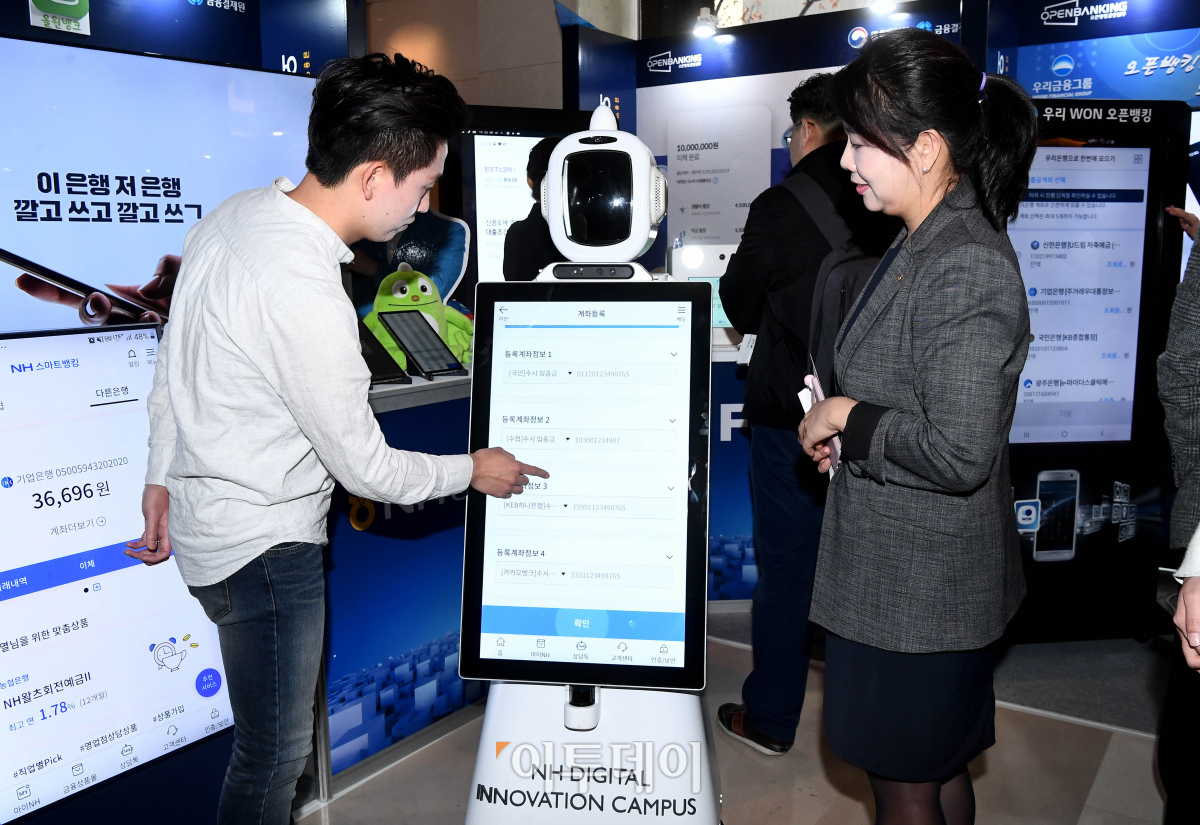 18일 서울 중구 소공로 웨스틴조선호텔에서 열린 오픈뱅킹 서비스 출범식에서 NH농협은행 관계자가 오픈뱅킹 서비스를 시연하고 있다.