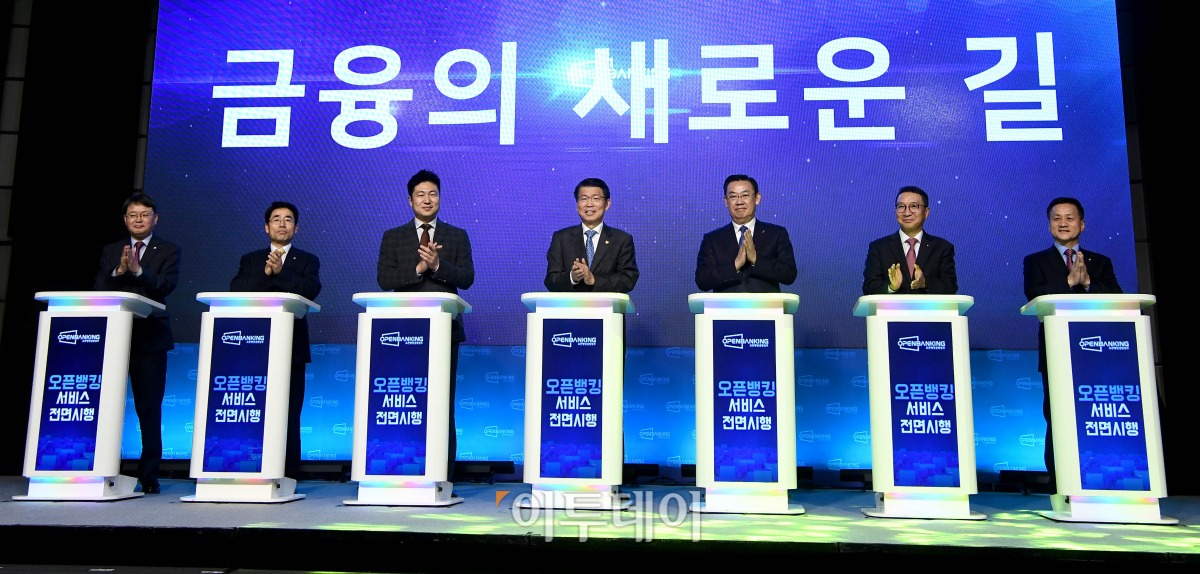 18일 서울 중구 소공로 웨스틴조선호텔에서 열린 오픈뱅킹 서비스 출범식에서 윤면식(왼쪽부터) 한국은행 부총재, 김영기 금융보안원장, 류영준 카카오페이 대표, 은성수 금융위원장, 김태영 전국은행연합회장, 김학수 금융결제원장, 권인원 금융감독원 부원장이 기념촬영을 하고 있다.