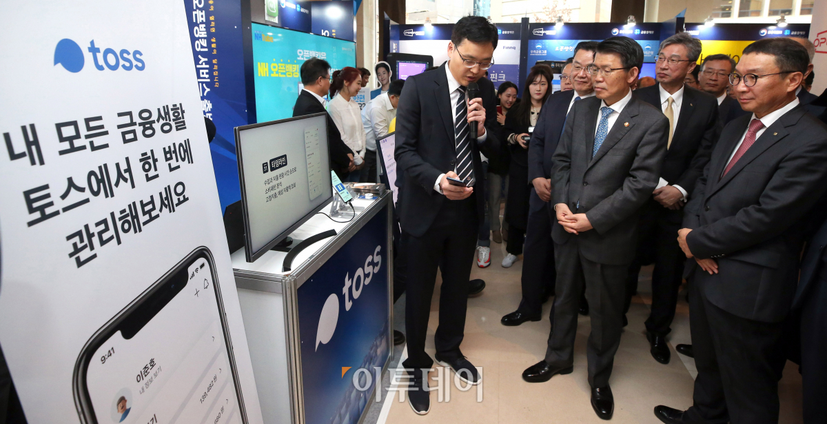 은성수 금융위원장, 김학수 금융결제원장, 김태영 전국은행연합회장 등이 18일 서울 중구 소공로 웨스틴조선호텔에서 열린 오픈뱅킹 서비스 출범식에서 토스 오픈뱅킹 서비스 시연 부스를 둘러보고 있다.