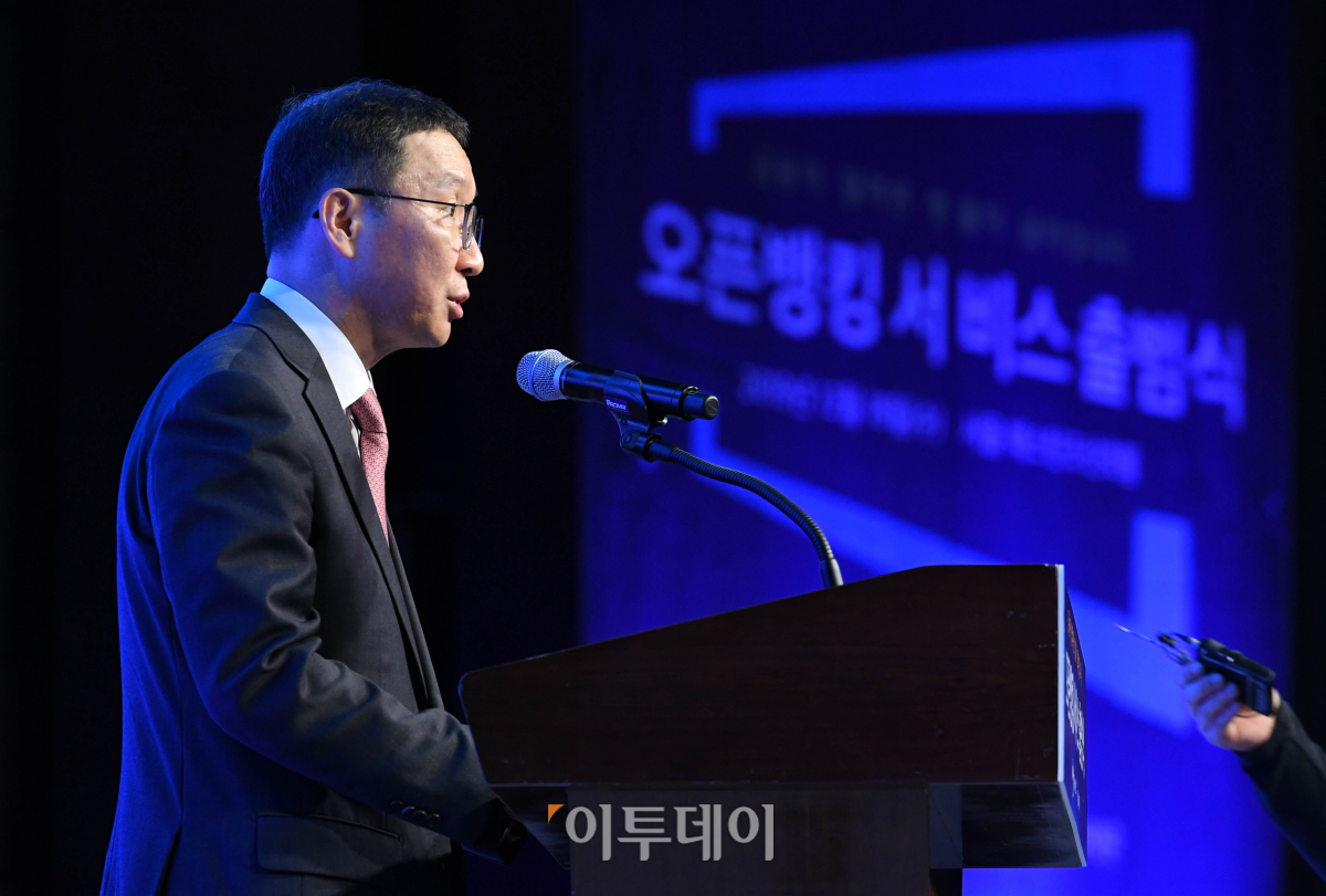 김학수 금융결제원장이 18일 서울 중구 소공로 웨스틴조선호텔에서 열린 오픈뱅킹 서비스 출범식에서 인사말을 하고 있다.