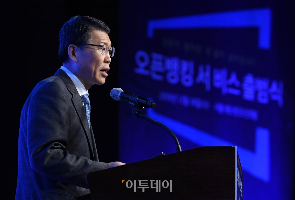 은성수 금융위원장이 18일 서울 중구 소공로 웨스틴조선호텔에서 열린 오픈뱅킹 서비스 출범식에서 인사말을 하고 있다.