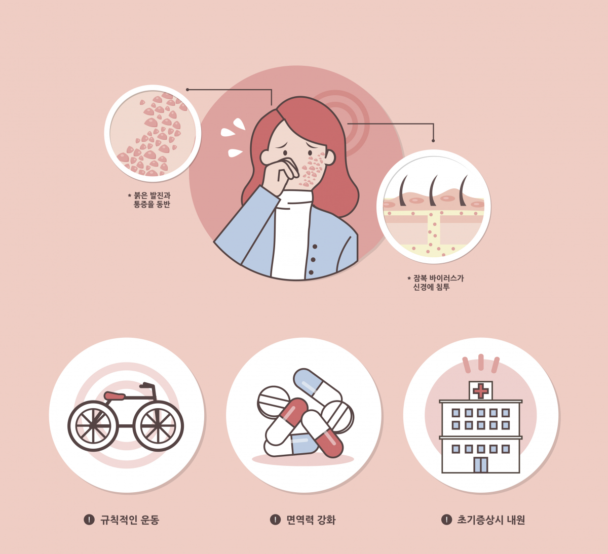 해당 질환은 면역력 저하로 발병하는 만큼 이를 예방하기 위해서는 규칙적인 운동과 올바른 생활습관을 길러야 한다. 예방접종 백신을 통해 예방도 가능하다. 특히 수두에 걸리지 않았던 65세 이상 고령자, 면역체계 변화로 수두, 대상포진에 걸렸던 사람, 면역력 저하가 의심되는 사람이라면 반드시 예방접종을 받아야 한다.