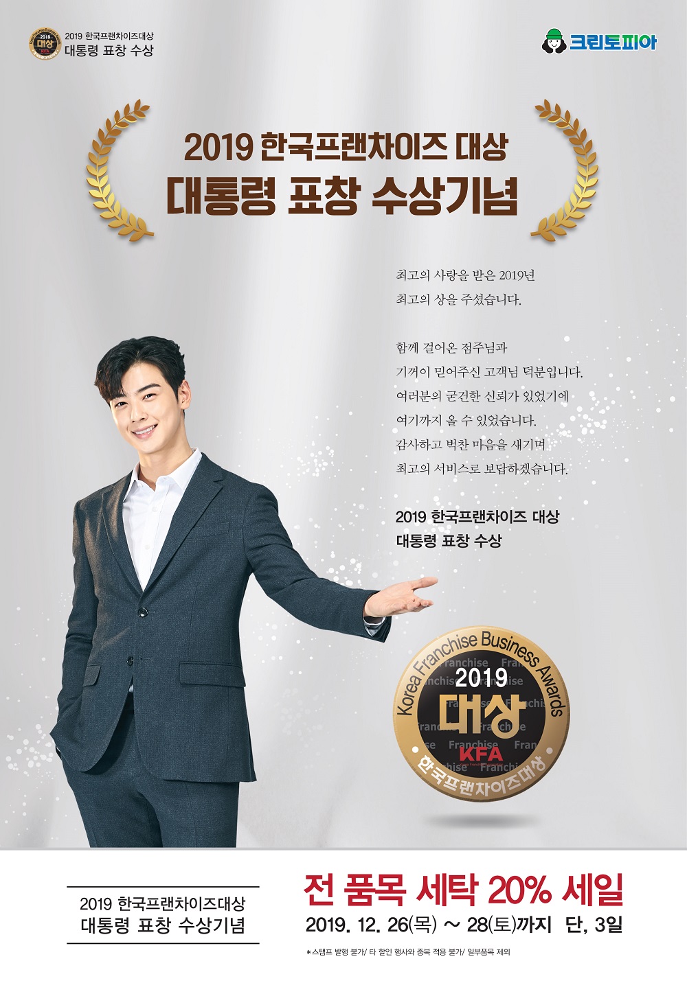 국내 프랜차이즈 산업 발전에 기여한 성과를 인정받아 모범 프랜차이즈 부문 대통령상을 수상했다. 이번 할인 행사에서는 점퍼, 패딩, 코트, 가죽/모피, 이불 등 전 품목 세탁 비용을 20% 할인 받을 수 있다.