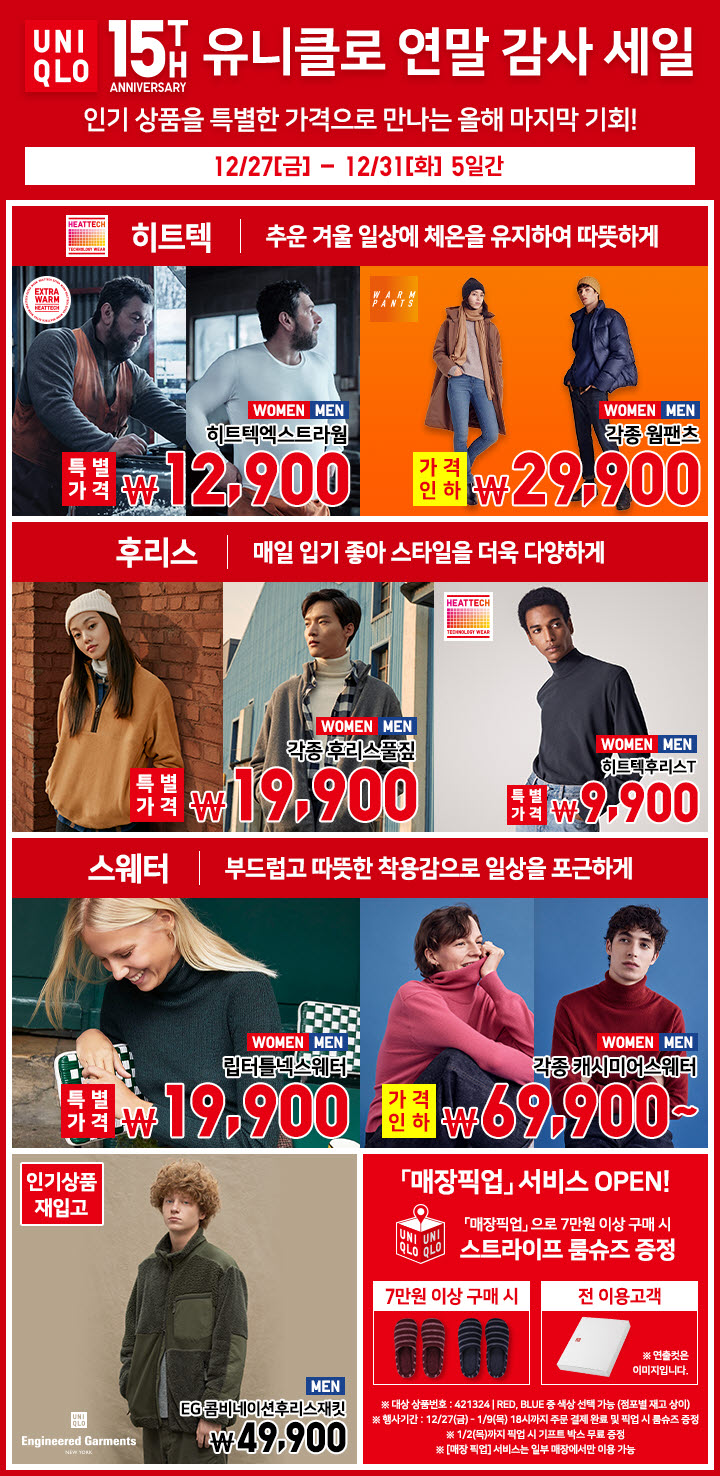 유니클로(UNIQLO)가 31일까지 올 한 해를 마무리하는 감사의 마음을 담은 ‘15주년 연말 감사 세일’을 진행한다.