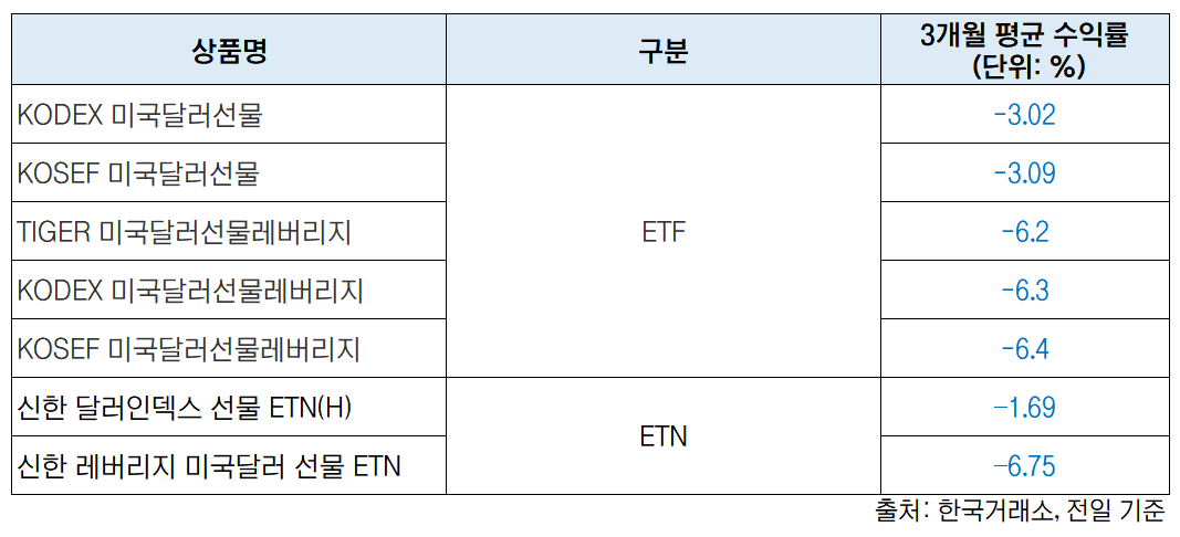 마찬가지로 달러 지수를 기초지수로 삼은 상장지수증권(ETN) 상품 수익률도 마이너스다. ‘신한 달러인덱스 선물 ETN(H)’ 상품은 최근 3개월 평균 수익률이 -1.69%를 기록했고, 마찬가지로 레버리지 상품인 ‘신한 레버리지 미국달러 선물 ETN’은 -6.75%로 대폭 내렸다.