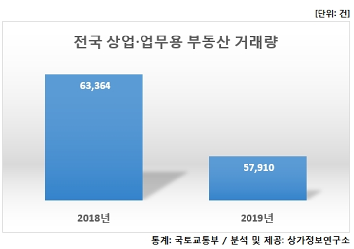 1일 상가정보연구소가 국토교통부 자료를 분석한 결과 지난해(12월 30일 기준) 상업·업무용 부동산 매매 거래량은 5만7910건으로 2018년(6만 3364건) 대비 약 8.6% 감소했다. 특히 이 기간 상업용 부동산(1·2종근린생활 및 판매시설) 거래량은 5만2993건으로 약 11% 줄었다.