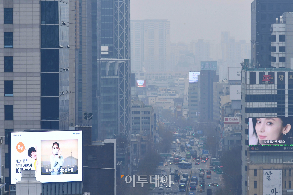 세밑 한파가 물러나자 새해부터 미세먼지가 찾아왔다. 서울을 비롯한 서쪽 지방과 영남 내륙 일부지역의 초미세먼지 농도가 ‘나쁨’ 단계를 보인 2일 오후 서울 종로구 일대가 미세먼지로 뿌옇다. 기상청은 3일 먼지가 차츰 퍼지면서 더 많은 지역에서 공기가 탁해지는 등 이번주 내내 미세먼지가 기승을 부릴 것으로 예상했다.