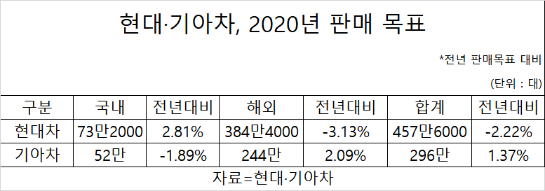 2일 현대차와 기아차는 올해 판매 목표를 각각 457만6000대와 296만 대로 확정했다. 현대차는 전년 대비 2.22% 감소한 숫자지만, 기아차는 전년보다 판매를 1.37% 끌어올린다는 계획이다.