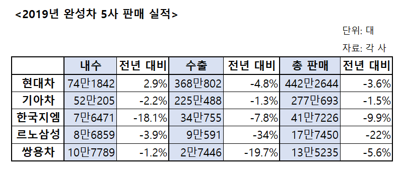 국내 완성차 5사의 지난해 판매량이 모두 2018년 대비 줄었다. 현대자동차만 내수 실적이 전년 대비 개선됐고, 기아차와 외자계 3사는 내수와 수출이 모두 감소했다.