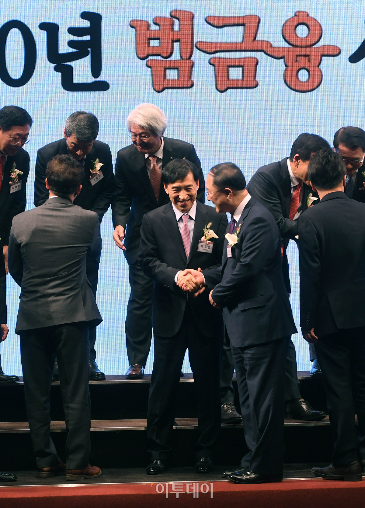 홍남기(오른쪽) 부총리 겸 기획재정부 장관과 이주열 한국은행 총재가 3일 서울 중구 신라호텔에서 열린 ‘2020년 범금융 신년인사회’에서 악수하고 있다.