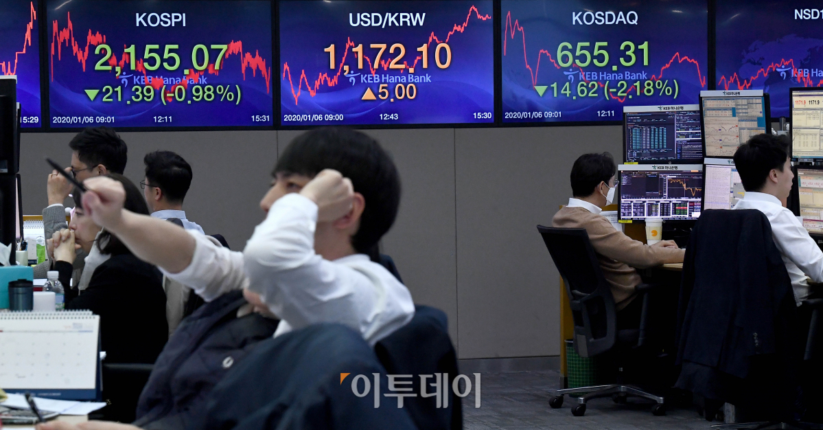 코스피가 중동발 리스크에 1% 가까이 하락 마감했다. 6일 서울 중구 KEB하나은행 딜링룸 전광판에 코스피와 코스닥이 전 거래일보다 각각 21.39포인트(0.98%)와 14.62포인트(2.18%) 내린 2155.07과 655.31을 가리키고 있다. 원달러 환율은 전 거래일 대비 5.00원 오른 1172.10원으로 거래를 마쳤다.