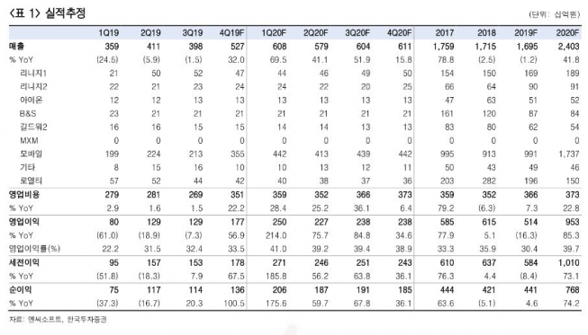 한국투자증권이 7일 엔씨소프트에 대해 리니지M과 리니지2M의 흥행 장기화가 이어지는 가운데 2020년은 이익 규모가 크게 올라가는 한 해가 될 전망이라고 판단했다. 이어 목표주가를 56만 원에서 62만 원으로 상향하고 투자의견 매수를 유지했다.