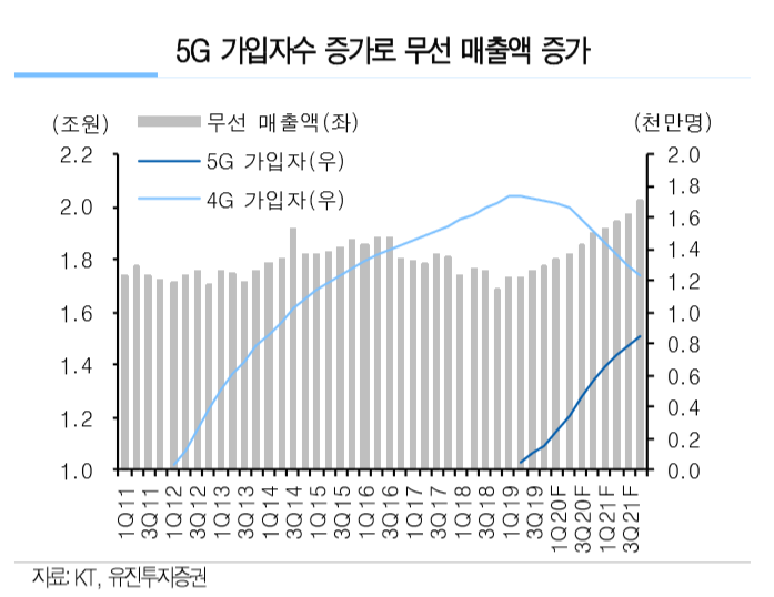 한 연구원은 “KT는 경쟁사 대비 무선 비중이 낮아 5G 확산에 따른 투자매력은 낮다”면서도 “5G 단말기 및 서비스 확대에 따른 가입자 증가와 ARPU 개선에 따른 무선 이익의 추세적 개선, 정년퇴직에 따른 인건비 감소가 예상된다는 점에서 투자포인트는 유효하다”고 평했다.