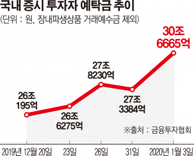 투자자 예탁금이 본격적으로 늘어난 것은 지난해 크리스마스(12월 25일) 이후부터다. 24조~26조 원대로 유지된 투자자 예탁금은 지난해 12월 26일 처음 27조 원을 돌파했다. 이어 곧바로 28조 원을 넘어선 뒤 새해 들어 30조 원을 넘어섰다.