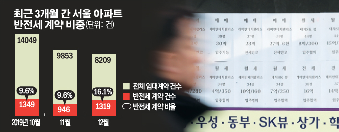 특히 반전세 계약이 월세 증가세를 이끌었다. 지난달 서울시에서 신고된 반전세 계약은 1319건으로, 전체 임대 계약의 16.1%를 차지한다. 2019년 월간 기준으로 가장 높은 비중이다. 특히 강남4구와 목동에선 임대 계약의 4건 가운데 한 건꼴(24.0%)로 반전세 계약이었다.