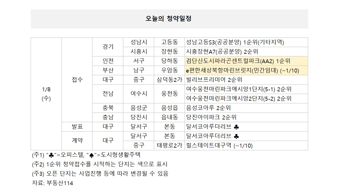 경기 성남시 '성남고등S3(공공분양)'은 1순위 기타지역으로, 대구 중구 '빌리브프리미어', 전남 '여수 웅천 마린파크애시앙1단지(5-1)' '여수 웅천 마린파크애시앙2단지(5-2)' 등에서는 2순위 청약을 받는다.
