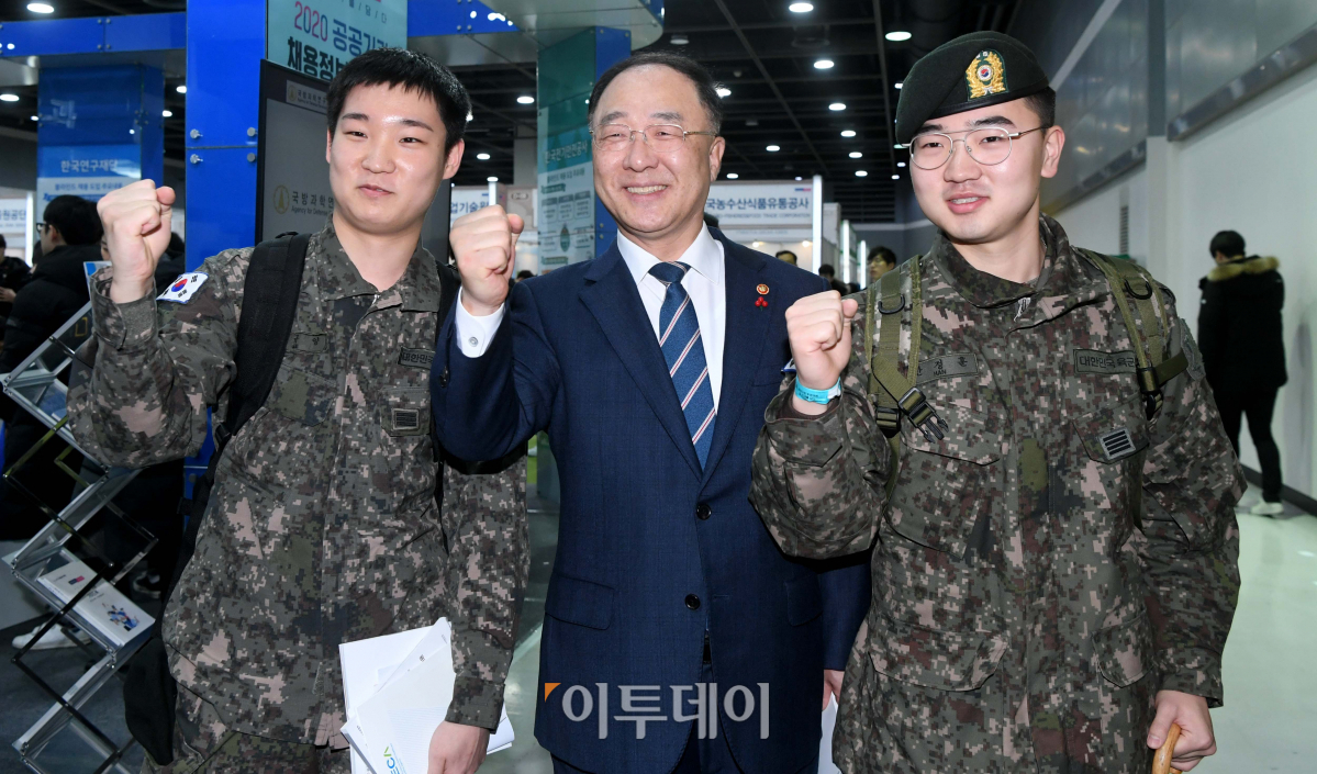 홍남기 부총리 겸 기획재정부 장관이 8일 서울 서초구 강남대로 aT센터에서 열린 ‘2020 공공기관 채용정보 박람회’ 에서 국군장병 구직자들을 격려하고 있다. 올해로 10회째를 맞이한 ‘공공기관 채용정보 박람회’는 취업 준비생에게 체계적인 채용정보와 취업노하우를 제공하고 공정채용 문화를 확산하기 위한 행사로 올해는 역대 최다 규모인 141개 주요 공공기관이 참가했다.