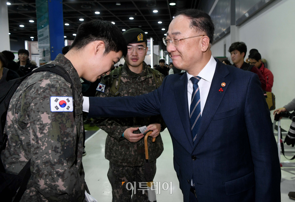 홍남기 부총리 겸 기획재정부 장관이 8일 서울 서초구 강남대로 aT센터에서 열린 ‘2020 공공기관 채용정보 박람회’ 에서 국군장병 구직자들을 격려하고 있다. 올해로 10회째를 맞이한 ‘공공기관 채용정보 박람회’는 취업 준비생에게 체계적인 채용정보와 취업노하우를 제공하고 공정채용 문화를 확산하기 위한 행사로 올해는 역대 최다 규모인 141개 주요 공공기관이 참가했다.