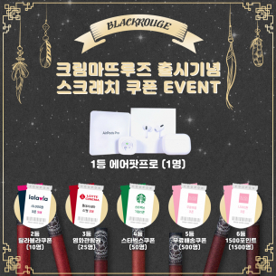 쿠폰에 나와있는 응모 번호를 블랙루즈몰 마이페이지 내 쿠폰탭을 통해 입력하면, 1등부터 6등까지 에어팟 프로•랄라블라 쿠폰 1만원권 5매 등 다양한 경품을 제공한다.