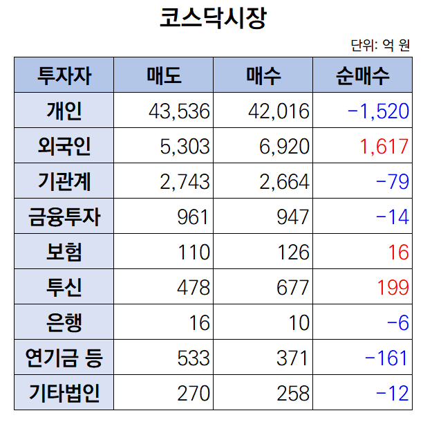 주체별로는 연기금 등이 161억 원어치를 팔아치우며 매도세를 이끌었다. 또 금융투자와 은행도 각각 14억 원, 6억 원어치를 순매도했다. 반면 투신과 보험이 199억 원, 16억 원어치를 사들이며 방어에 나섰다.