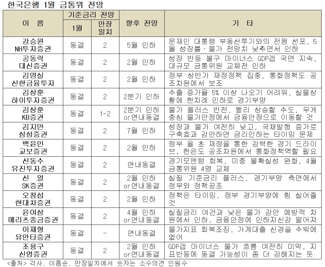 신얼 SK증권 연구원은 “명목금리는 역사상 최저나 실질금리는 플러스라는 점에서 덜 완화적이다. 인하여력은 존재한다. 또, 경기부양 측면에서 정부 공조차원에서의 인하가 가능하다고 본다”고 전했다. 공동락 대신증권 연구원은 “잠재성장률을 하회하는 마이너스 GDP갭 국면은 지속될 것으로 보이는 만큼 완화적인 통화정책 행보에 대한 기대는 불가피하다”며 “2명의 소수의견 개진 후 대규모 금통위원 교체 이전인 2월 기준금리 인하를 예상한다”고 밝혔다.