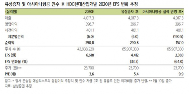 백재승 삼성증권 연구원은 “HDC현대산업개발이 아시아나항공 인수 자금 조달 목적으로 10일 장 종료 후 기존 주식 수의 50%에 해당하는 유상증자를 발표했다”며 “현시점에서 발행 가격은 1만8550원으로 10일 종가 대비 22% 낮은 수준”이라고 분석했다.