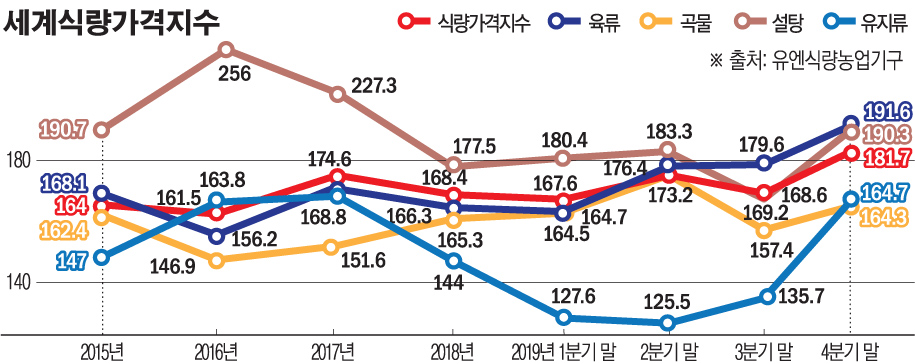 13일 농림축산식품부에 따르면 유엔 식량농업기구(FAO)가 발표한 지난해 12월 세계식량가격지수는 181.7로 2014년 이후 5년만에 최고치를 경신했다. 2014년 평균 지수는 201.8이었으나 2015년부터 160~170대 선에서 소폭 등락을 거듭하던 지수가 180대를 넘어선 것이다.