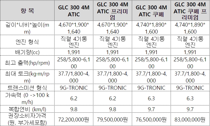 가격은 더 뉴 GLC 300 4매틱 7220만 원, 더 뉴 GLC 300 4매틱 쿠페 7650만 원이다.