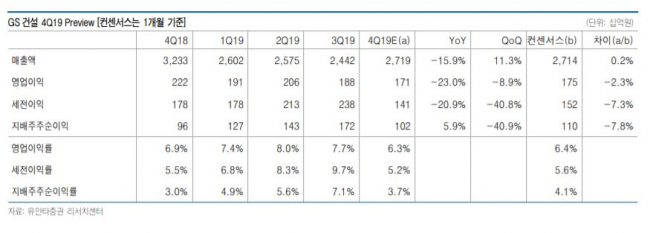 유안타증권이 14일 GS건설에 대해 주택 분양 축소에 후행한 매출과 이익 감소 흐름은 작년 4분기 실적에도 이어질 전망이라고 분석했다. 목표주가는 4만2000원에서 3만9000원으로 하향하고, 투자의견 매수는 유지했다.