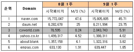 인터넷조사기관 코리안클릭의 8월 집계에 따르면 인터넷 시작 페이지를 싸이월드로 설정한 이용자가 331만690명으로, 야후의 220만1983명을 누르고 3위에 오른 것으로 조사됐다.
