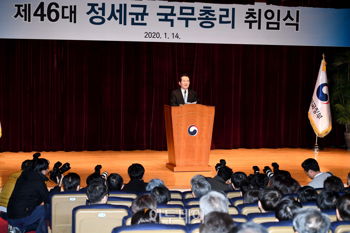 정세균 신임 국무총리가 14일 서울 종로구 정부서울청사 별관에서 열린 취임식에서 취임사를 하고 있다.