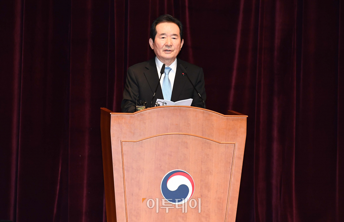 정세균 신임 국무총리가 14일 서울 종로구 정부서울청사 별관에서 열린 취임식에서 취임사를 하고 있다.