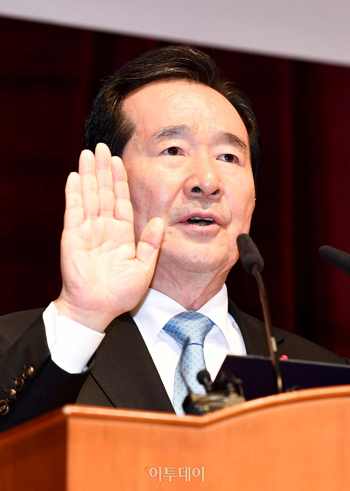 정세균 신임 국무총리가 14일 서울 종로구 정부서울청사 별관에서 열린 취임식에서 취임선서를 하고 있다.