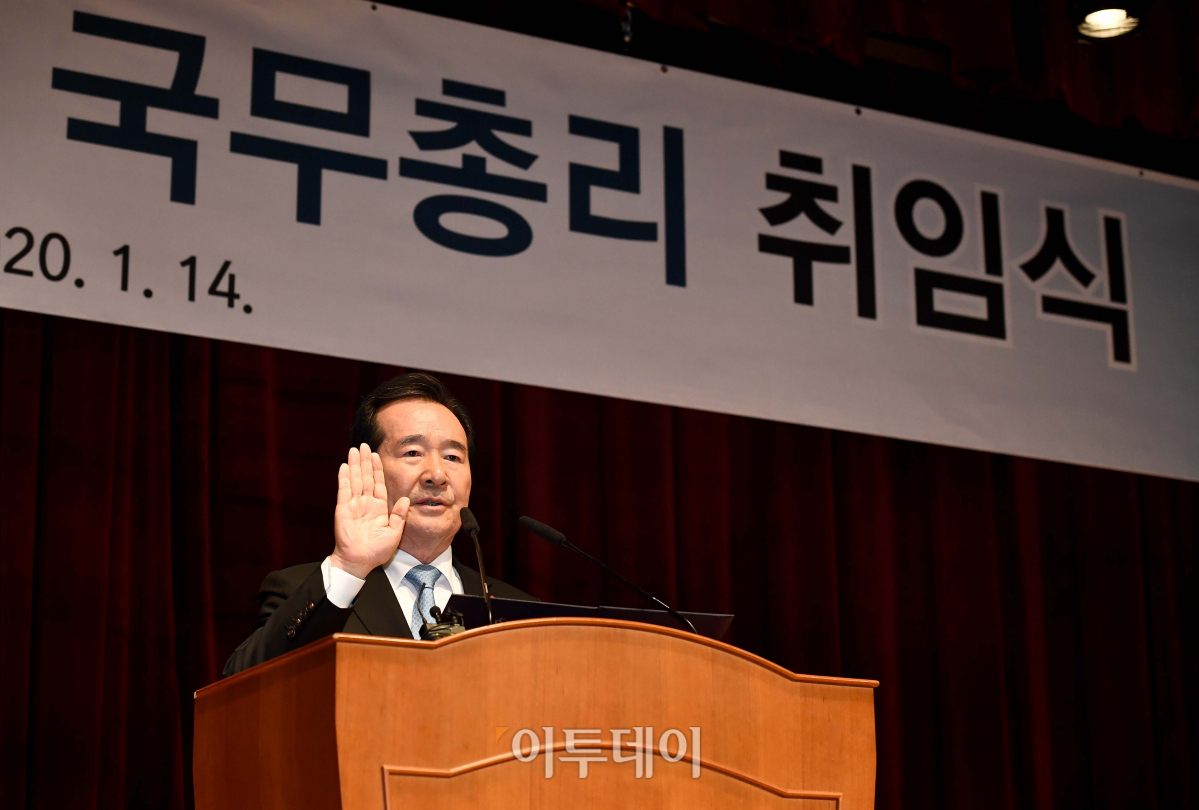정세균 신임 국무총리가 14일 서울 종로구 정부서울청사 별관에서 열린 취임식에서 취임선서를 하고 있다.