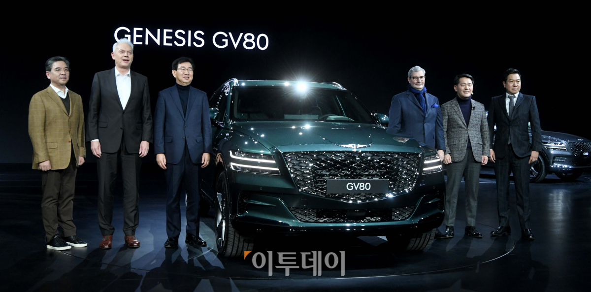 제네시스가 15일 경기 고양시 킨텍스에서 럭셔리 플래그십 SUV GV80의 공식 출시행사를 가졌다. GV80는 제네시스가 처음 선보이는 후륜구동 기반의 대형 SUV로 3.0 디젤 모델부터 출시한 뒤 추후 가솔린 2.5·3.5 터보 모델을 더해 총 3가지 엔진 라인업을 구성할 예정이다. 3.0 디젤 모델의 판매가격은 6580만원부터 시작된다. 왼쪽부터 장재훈 현대차 국내 사업 본부장 (부사장), 알버트 비어만 현대차 연구 개발 본부 사장, 이원희 현대차 사장, 루크 동커볼케 현대차 디자인 담당 부사장, 이용우 제네시스 사업부 부사장, 이상엽 현대차 디자인센터장(전무).