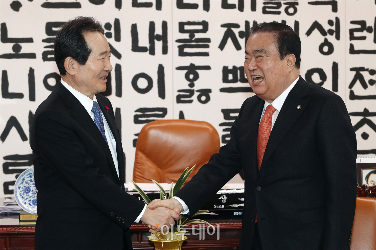 문희상 국회의장이 15일 서울 여의도 국회 의장실에서 정세균 신임 국무총리의 예방을 받고 있다.
