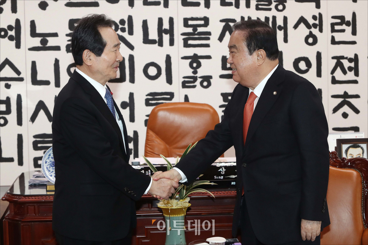 문희상 국회의장이 15일 서울 여의도 국회 의장실에서 정세균 신임 국무총리의 예방을 받고 있다.