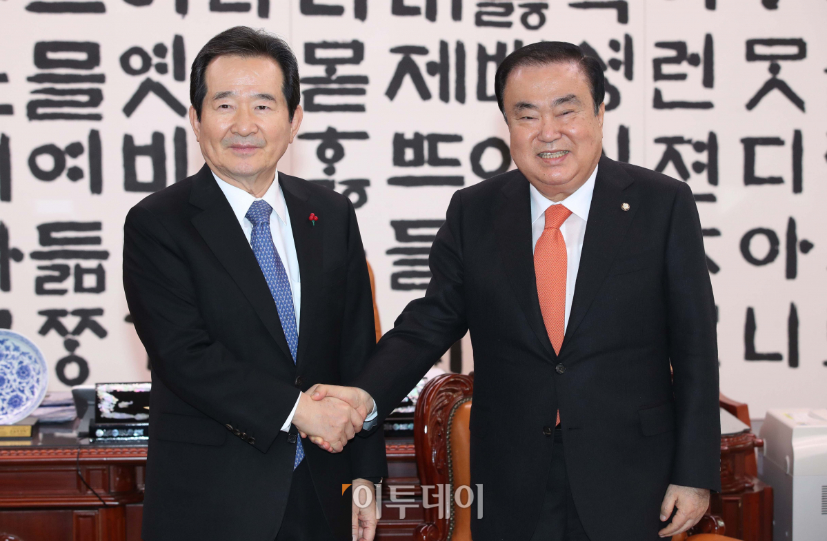문희상 국회의장이 15일 서울 여의도 국회 의장실에서 정세균 신임 국무총리의 예방을 받고 있다.