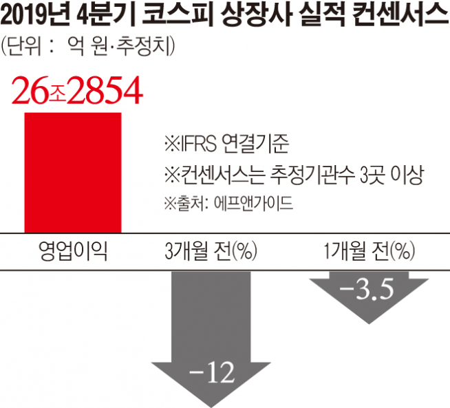15일 금융정보업체 에프엔가이드에 따르면 유가증권시장(코스피)에 상장된 기업 중 증권사 3곳 이상 전망치를 내놓은 165개 기업의 지난 4분기 영업이익 추정치는 26조2854억 원이다. 3개월 전 컨센서스 추정치(29조8810억 원)보다 12.0% 줄어든 규모다. 한 달 전(27조2384억 원)보다도 3.5% 추정 영업이익을 줄이는 등 실적 추정치를 연이어 낮추고 있다.