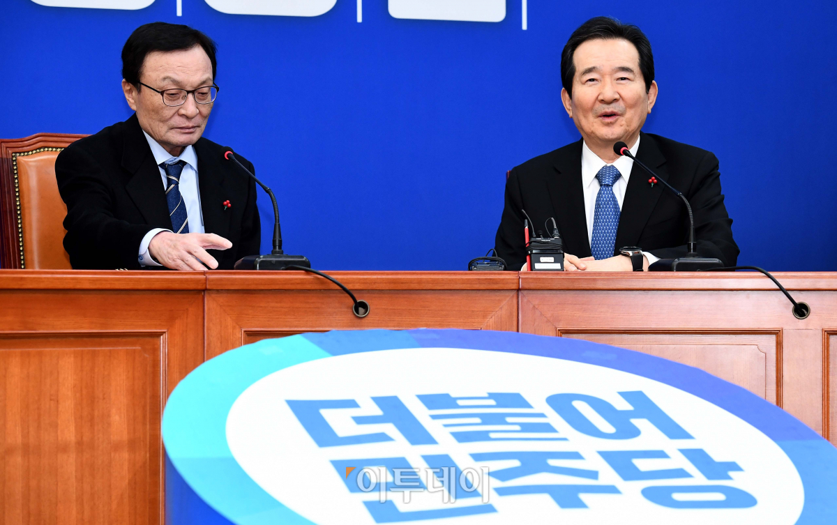 이해찬 더불어민주당 대표가 15일 서울 여의도 국회 당대표실에서 정세균 신임 국무총리의 예방을 받고 있다.