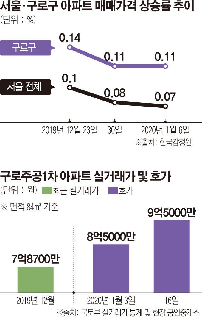 실제 구로구에선 지난달 말까지 거래가가 9억 원을 밑돌던 구로동 '신도림 태영타운' 전용 84㎡형 호가가 현재 9억8000만 원까지 치솟았다. 개봉동 현대아파트 전용 84㎡의 최근 시세는 7억 원 수준이다. 이 아파트의 지난해 최고 실거래가는 6억5700만 원이었다.