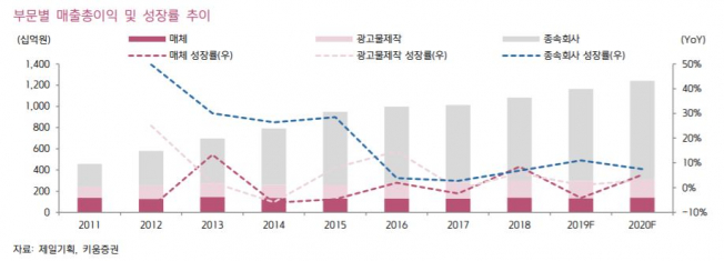 이 연구원은 “최근 국내외 광고 시장은 대략 2~3% 수준을 기록해 산업 성장에 따라 기업의 동반성장까지 이뤄내기에는 무리가 있다”며 “광고회사 인수합병을 통해 해결할 가능성이 크다”고 판단했다.