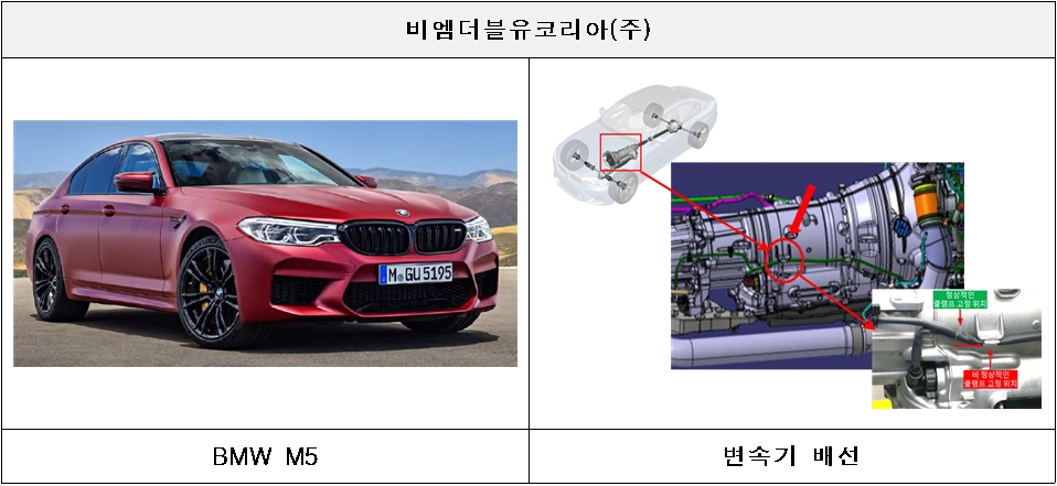 둘째 BMW코리아에서 수입, 판매한 BMW M5 등 2개 차종 171대는 변속기 연결 배선의 설치 위치 및 고정 등에서 결함이 확인됐다