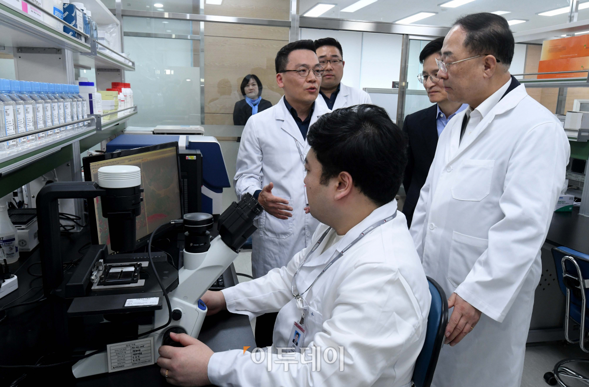 홍남기 부총리 겸 기획재정부 장관이 16일 경기 성남시 소재 바이오산업 벤처기업인 에이프로젠을 찾아 관계자에게 연구시설에 대한 설명을 듣고 있다. 항체신약과 동등생물의약품(바이오시밀러)을 연구·생산하는 에이프로젠은 임직원 371명, 자산총액 3742억 원인 국내 11번째, 바이오 분야에선 첫 유니콘기업이다. 홍 부총리는 전날 혁신성장 전략회의에서 ‘바이오산업 혁신 정책방향 및 핵심과제’, ‘바이오헬스 핵심규제 개선방안’을 확정한 것을 계기로 이곳을 찾았다.