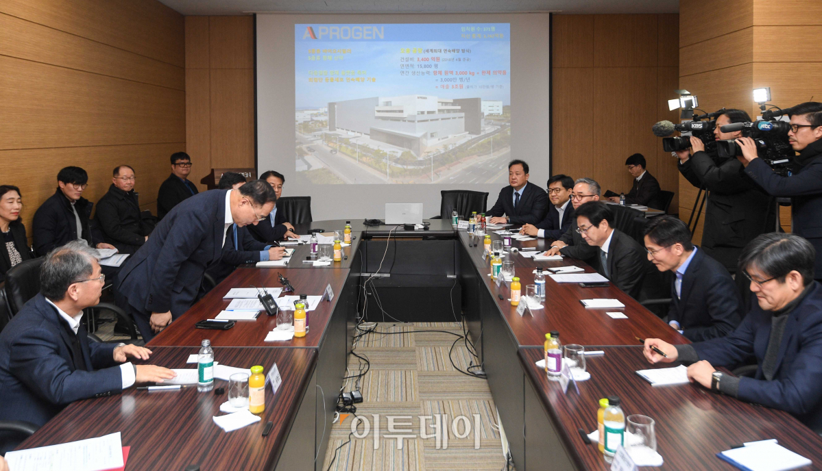 홍남기 부총리 겸 기획재정부 장관이 16일 경기 성남시 소재 바이오산업 벤처기업인 에이프로젠을 찾아 바이오업계 관계자들과 간담회를 갖고 있다. 항체신약과 동등생물의약품(바이오시밀러)을 연구·생산하는 에이프로젠은 임직원 371명, 자산총액 3742억 원인 국내 11번째, 바이오 분야에선 첫 유니콘기업이다. 홍 부총리는 전날 혁신성장 전략회의에서 ‘바이오산업 혁신 정책방향 및 핵심과제’, ‘바이오헬스 핵심규제 개선방안’을 확정한 것을 계기로 이곳을 찾았다.