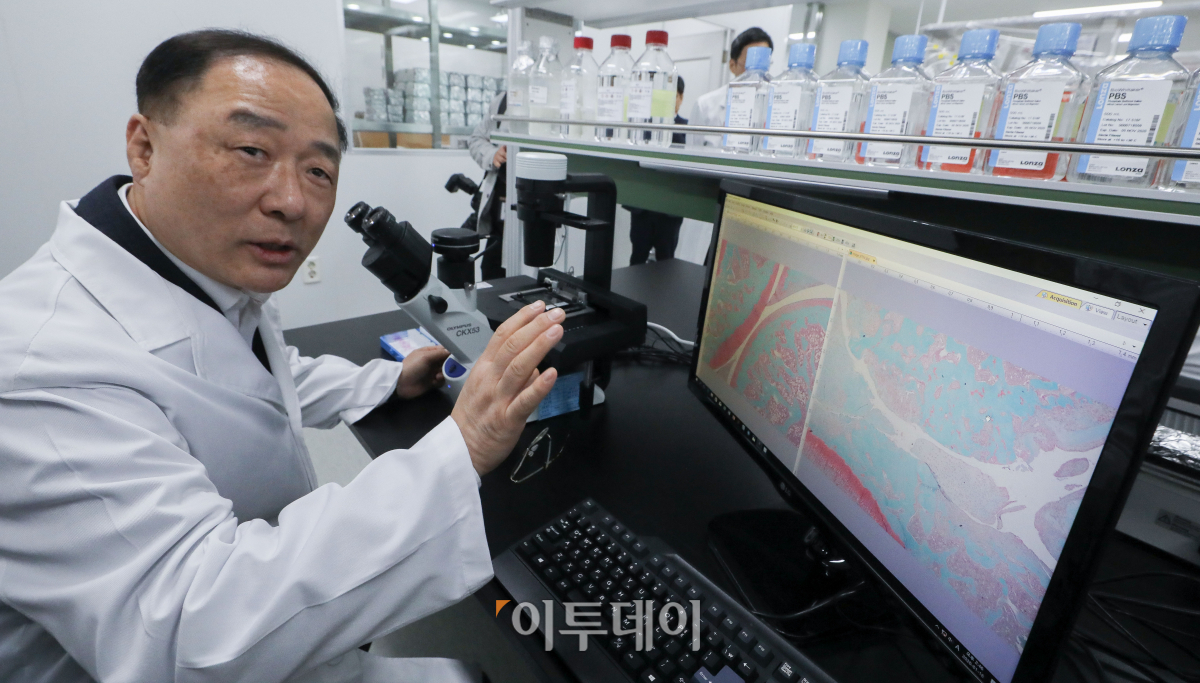 홍남기 부총리 겸 기획재정부 장관이 16일 경기 성남시 소재 바이오산업 벤처기업인 에이프로젠을 찾아 현미경으로 쥐의 무릎관절을 살펴보고 있다. 항체신약과 동등생물의약품(바이오시밀러)을 연구·생산하는 에이프로젠은 임직원 371명, 자산총액 3742억 원인 국내 11번째, 바이오 분야에선 첫 유니콘기업이다. 홍 부총리는 전날 혁신성장 전략회의에서 ‘바이오산업 혁신 정책방향 및 핵심과제’, ‘바이오헬스 핵심규제 개선방안’을 확정한 것을 계기로 이곳을 찾았다.