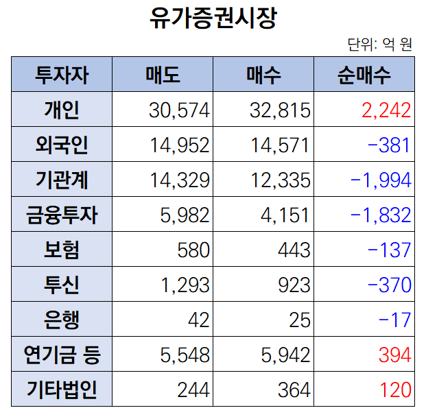 이날 기관은 1994억 원어치를 쏟아내며 연초 이후 11일 연속 순매도했다. 외국인도 381억 원어치를 팔아치운 가운데 개인 투자자는 2242억 원어치를 순매수했다.