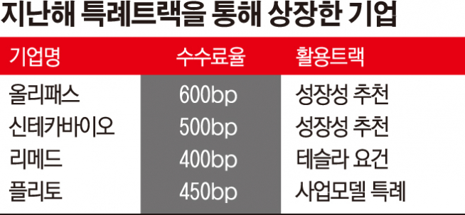 해당 특례트랙으로 증시에 입성한 기업들을 살펴보면, 최소 400~500bp 수준의 딜 수수료를 책정했다. 지난해 가장 큰 비율로 수수료를 지급한 기업은 올리패스다. 전체 공모금액에서 600bp(6%)가량인 8억6500만 원을 주관사 몫으로 배분했고, 이 중 인수비율에 따라 공동대표 주관사였던 미래에셋대우와 키움증권이 각각 5억3600만 원, 3억2800만 원을 가져갔다. 라파스, 신테카바이오, 브릿지바이오, 캐리소프트는 500bp로 뒤를 이었고, 플리토 450bp, 리메드, 메탈라이프 등 400bp 순으로 수수료율이 높았다.