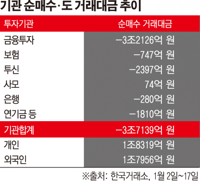 17일 한국거래소에 따르면 연초부터 이날까지 기관투자자는 12거래일 연속 순매도를 이어가고 있다. 순매도 금액은 총 3조7138억6997만 원에 달한다.